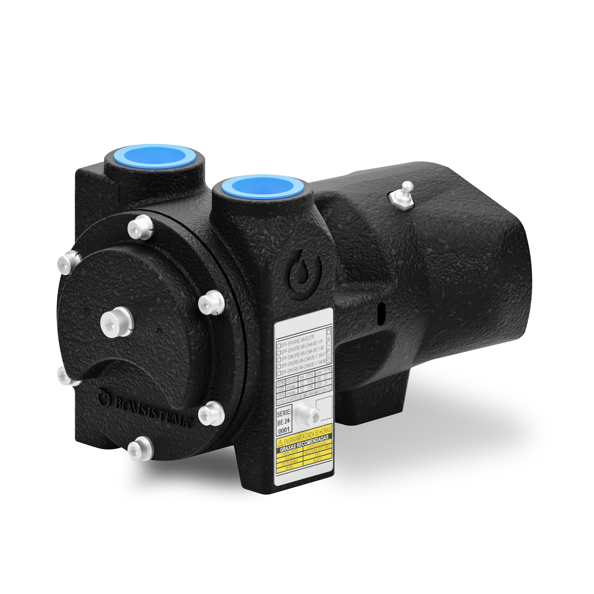 A bomba está disponível em configurações monobloco, com o motor acoplado diretamente ao corpo da bomba, e na versão TDP para tratores, que pode ser adaptada com base metálica ou trava-corrente. Ambas as opções garantem excelente desempenho e simplicidade na instalação.
